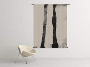 Wandkleed in naturel tinten. Dit past heel goed in een interieur met naturel tinten en bijvoorbeeld zwarte accessoires of meubels. Het is een oorspronkelijke monoprint uit eigen studio en zo bewerkt dat het uitgevoerd kan worden als wandkleed.
